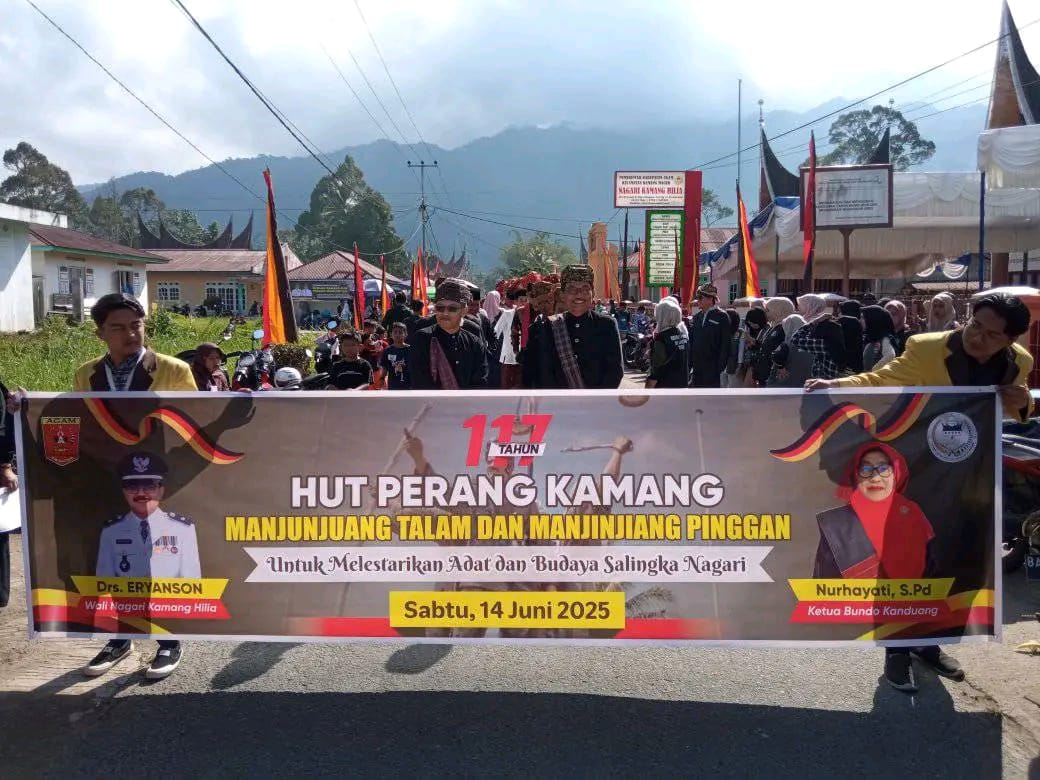 Agam GMU News – Warga tumpah ruah di jalan utama Nagari Kamang Hilia, Kabupaten Agam, dalam rangka memperingati Hari Ulang Tahun (HUT) ke-117 Perang Kamang. Peringatan tahun ini mengusung tema “Manjunjung Talam dan Manjinjiang Pinggan: Untuk Melestarikan Adat dan Budaya Salingka Nagari.”